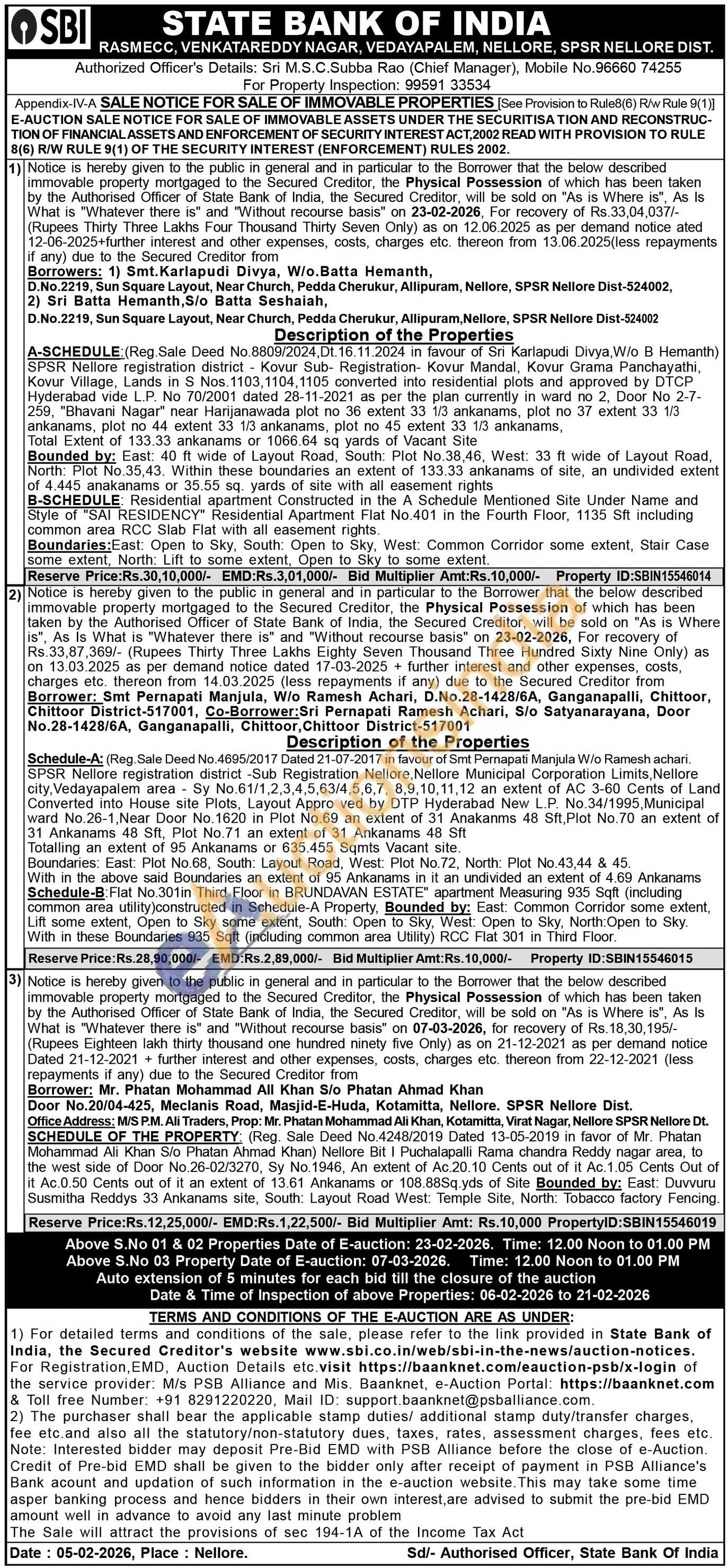 Schedule-A: (Reg. Sale Deed No.4695/2017 Dated 21-07-2017 in favour of Sint Pernapati Manjula Wio Ramesh achari. SPSR Nellore registration district-Sub Registration Nellore, Nellore Municipal Corporation Limits, Nellore city, Vedayapalem area Sy No.61/1,2,3,4,5,63/4,5,6,7, 8,9,10,11,12 an extent of AC 3-60 Cents of Land Converted into House site site Plots, Layout Appro ved by DTP Hyderabad New LP No.34/1995 Municipal ward No.26-1, Near Door No. 1620 in Plot No.69 an extent of 31 Anakanms 48 Sft, Plot No.70 an extent of 31 Ankanams 48 Sft, Plot No 71 an extent of 31 Ankanams 48 Sft Totalling an extent of 95 Ankanams or 635.455 Sqmts Vacant site. Boundanes: East: Plot No.68, South: Layout Road, West Plot No 72. North: Plot No.43,44 & 45. With in the above said Boundaries an extent of 95 Ankanams in it an undivided an extent of 4.69 Ankariams Schedule-B Flat No.301in Third Floo Floor in BRUNDAVAN ESTATE apartment N apartment Measuring 935 Sqft (including common area utility)constructed in Schedule-A Property, Bounded by: East: Common Corridor some extent, Lift some extent, Open to Sky some extent, South: Open to Sky, West: Open to Sky, North: Open to Sky. With these Boundaries 935 Sqft (including common area Utility) RCC Flat 301 in Third Floor