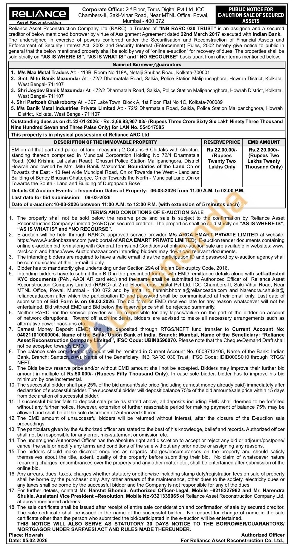 EM on all that part and parcel of land measuring 2 Cottahs 6 Chittaks with structure standing thereon comprised in Muncipal Corporation in Holding No 72/4 Dharmatala Road, (Old Krishna Lal Jalan Road), Ghusuri Police Station Mallipanchgora, District Howrah