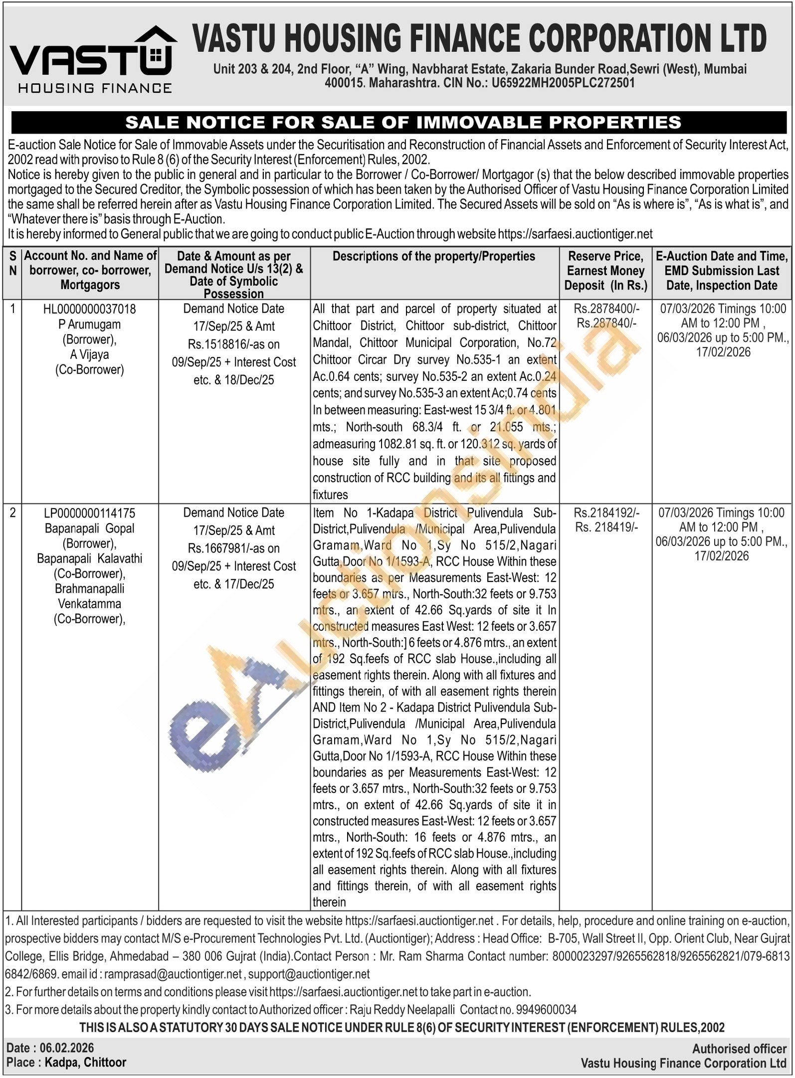 Item No 1-Kadapa District Pulivendula Sub-District, Pulivendula /Municipal Area, Pulivendula Gramam, Ward No 1,Sy No 515/2, Nagari Gutta, Door No 1/1593-A, RCC House Within these boundaries as per Measurements East-West: 12 feets or 3.657 mtrs., North-South:32 feets or 9.753 mtrs., an extent of 42.66 Sq.yards of site it In constructed measures East West: 12 feets or 3.657 mtrs., North-South:] 6 feets or 4.876 mtrs., an extent of 192 Sq.feefs of RCC slab House. including all easement rights therein. Along with all fixtures and fittings therein, of with all easement rights therein AND Item No 2-Kadapa District Pulivendula Sub-District, Pulivendula Municipal Area, Pulivendula Gramam, Ward No 1,Sy No 515/2, Nagari Gutta, Door No 1/1593-A, RCC House Within these boundaries as per Measurements East-West: 12 feets or 3.657 mtrs., North-South:32 feets or 9.753 mtrs., on extent of 42.66 Sq.yards of site it in constructed measures East-West: 12 feets or 3.657 mtrs., North-South: 16 feets or 4.876 mtrs., an extent of 192 Sq.feefs of RCC slab House, including all easement rights therein. Along with all fixtures and fittings therein, of with all easement rights therein