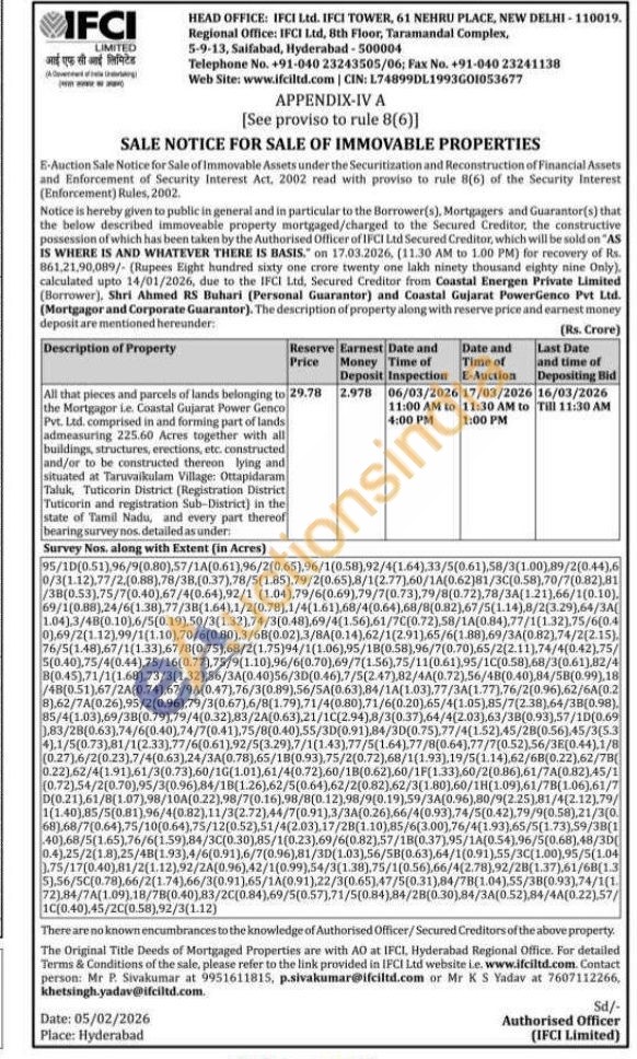 All that pieces and parcels of lands belonging to the Mortgagor Le. Coastal Gujarat Power Genco Pvt. Ltd. comprised in and forming part of lands admeasuring 225.60 Acres together with all buildings, structures, erections, etc. constructed and/or to be constructed thereon lying and situated at Taruvaikulam Village: Ottapidaram Taluk, Tuticorin District (Registration District Tuticorin and registration Sub-District) in the state of Tamil Nadu, and every part thereof bearing survey nos. detailed as under: