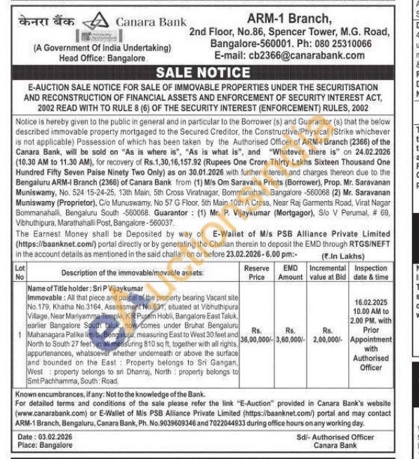 Immovable: All that piece and parcel of the property bearing Vacant site No. 179, Khatha No.3164, Assessment No 631, situated at Vibhuthipura Village, Near Mariyamma Temple, KR Puram Hobli, Bangalore East Taluk earlier Bangalore South taluk, now comes under Bruhat Bengaluru Mahanagara Palike limits, Bengaluru, measuring East to West 30 feet and North to South 27 feet, in all measuring 810 sq ft, together with all rights appurtenarices, whatsoever whether underneath or above the surface and bounded on the East Property belongs to Sri Gangan West property belongs to sri Dhanraj, North property belongs to Smt Pachhamma, South: Road