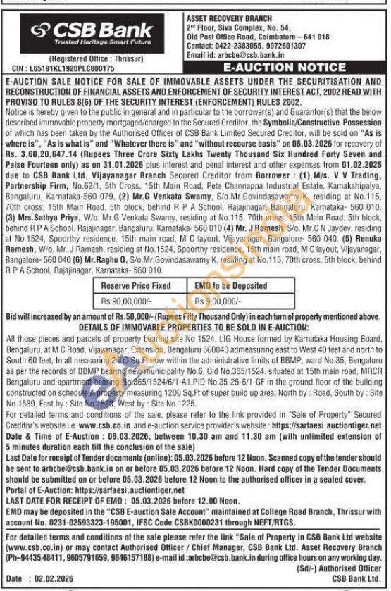 All those pieces and parcels of property bearing site No 1524, LIG House formed by Karnataka Housing Board, Bengaluru, at M C Road, Vijayanagar, Extension, Bengaluru 560040 admeasuring east to West 40 feet and north to South 60 feet, In all measuring 2400 Sq. Ft now within the administrative limits of BBMP, ward No.35, Bengaluru as per the records of BBMP bearing new municipality No. 6, Old No.365/1524, situated at 15th main road, MRCR Bengaluru and apartment bearing No.365/1524/6/1-A1, PID No.35-25-6/1-GF in the ground floor of the building constructed on schedule A property measuring 1200 Sq. Ft of super build up area, North by: Road, South by: Site No.1539, East by: Site No.1523, West by: Site No.1225.