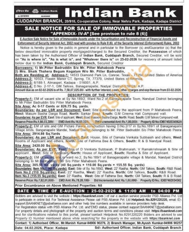Property-1: EM of vacant site at Sy No. 189/2, Ward No. 2 of Banaganapalle Town, Nandyal District belonging to Mr. Pitter Badruddin Slo Pitter Mahaboob Peera Site Area: Ac 0-17 Cents or 826.75 Sq. yards. Boundaries: As per LSR and Document: East: Site purchased by the applicant from P Mahaboob Peera, West: Masum Basha Darga Road, North: Sarkar Road, South: GM Cinema Hall Compound wall Boundaries: As per EVR East: Site of applicant, West: Road Masoom Basha Darga, North: Road, South: GM Talkies Compound wall