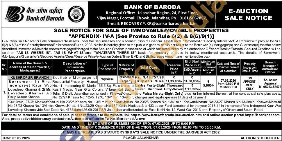 Equitable Mortgage of Residential Property-House No. 11, measuring 01 Marla 155.5 Sq. Ft situated at Kashi Nagar, Near Gita Colony, Village Kot Sadiq Tehsil & Distt. Jalandhar comprised in Khewat Khatuni No. 22/24 Khasra No. 12//5, 12//6, 13//1min, 13//9min 13//10min, 27//3; Khewat/Khatuni No.23/25 Khasra No. 13//1min; Khewat/Khatuni No.23/26 Khasra No. 13//1 min; Khewat/Khatuni No.23/27 Khasra No. 13//9min; Khewat/Khatuni No.23/28 Khasra No.13//1 min; Khewat Khatuni No. 23/29 Khasra No. 13//1 Omin, Hadbust No. 433 as per Fard Jamabandi for the year 2013-14 in the name of Mrs. Inderpreet Kaur W/o Lovedeep Khanna vide Sale Deed No. 4736 dated 26.09.2017 SR-Jalandhar andbounded as: East: Kothi No. 12, West Gali 20', North: Property of Others and South: Road
