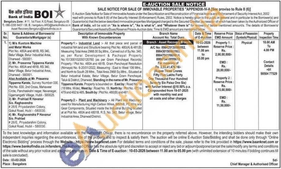 Property 1: Industrial Land All that piece and parcel of Industrial NA land and Structure bearing Plot No. 480(A) & 481(B) Measuring Total Area 2968.00 Sq.Mirs., Carved out of Sy No. 340, as per Rural Development & Pachayat Property No. 151300102000120760 (as per Gram Panchayat Records) Property/Plot No. 480A and 4818, Gram Panchayat Resolution (Nimaya) No. 6-20/01/2022, Measuring: East to West 106 Mtrs.. and North to South 28 Mtrs., Total Area 2968 Sq. Mtrs, Situated at Belur Industrial Estate, Belur Village, Belur Gram Panchayat. Taluk & District, Dharwad, Standing in the name of Mr. Prasanna Tippanna Karate. Property is bounded on: East by: Road No. 18 (18 Mtrs. Wide), West by: Road No. 19, North by: Plot No. 475 to 479 and 482 to 485, South by: Plot No. 480(B) and 481