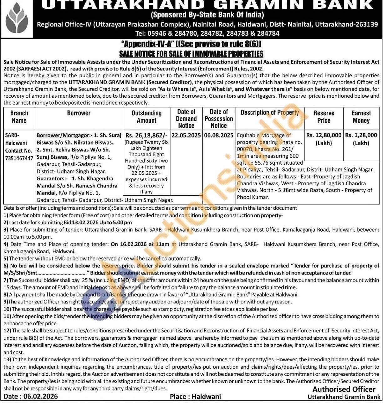 property bearing Khata no. 00070, khasra No. 261/1min area measuring 600 Equitable Mortgage of sqft i.e 55.76 sqmt situated at Pipaliya, Tehsil- Gadarpur, Distrit- Udham Singh Nagar. Boundries are as follows:- East-Property of Jagdish Chandra Vishwas, West - Property of Jagdish Chandra Vishwas, North-5.18mt wide Rasta, South Property of Phool Kumar.