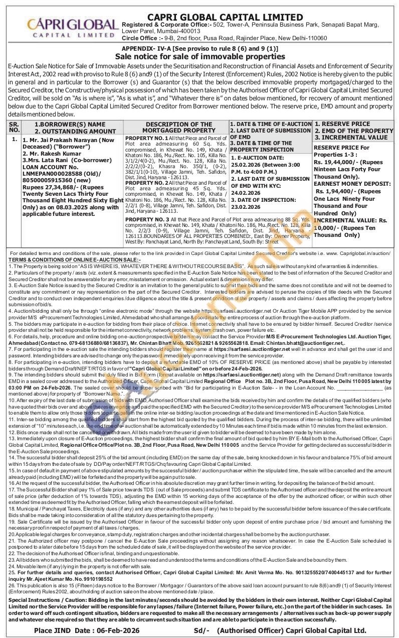PROPERTY NO. 1 All that Piece and Parcel of Plot area admeasuring 60 Sq. Yds. compromised, in Khewat No. 149, Khata /Khatoni No. 186, Mu./Rect. No. 105, Killa No. 3/1/2/4(0-2), Mu./Rect. No. 128, Killa No. 2/2/2/(0-2), Khasra No. 350/1, (0-2), 382/1/1(0-10), Village Jamni, Teh. Safidon, Dist. Jind, Haryana - 126113.