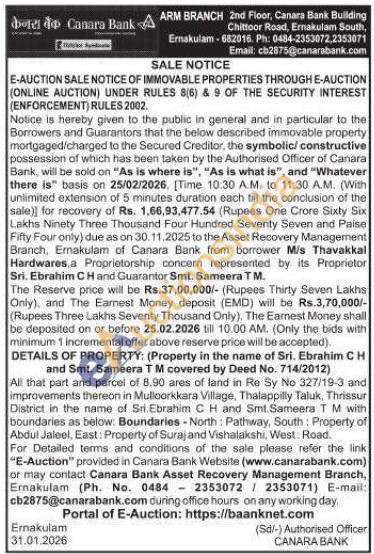 DETAILS OF PROPERTY: (Property in the name of Sri. Ebrahim CH and Smt. Sameera TM covered by Deed No. 714/2012) : All that part and parcel of 8.90 ares of land in Re Sy No 327/19-3 and improvements thereon in Mulloorkkara Village, Thalappilly Taluk, Thrissur District in the name of Sri. Ebrahim C H and Smt Sameera TM with boundaries as below: Boundaries-North: Pathway, South: Property of Abdul Jaleel, East: Property of Suraj and Vishalakshi, West. Road