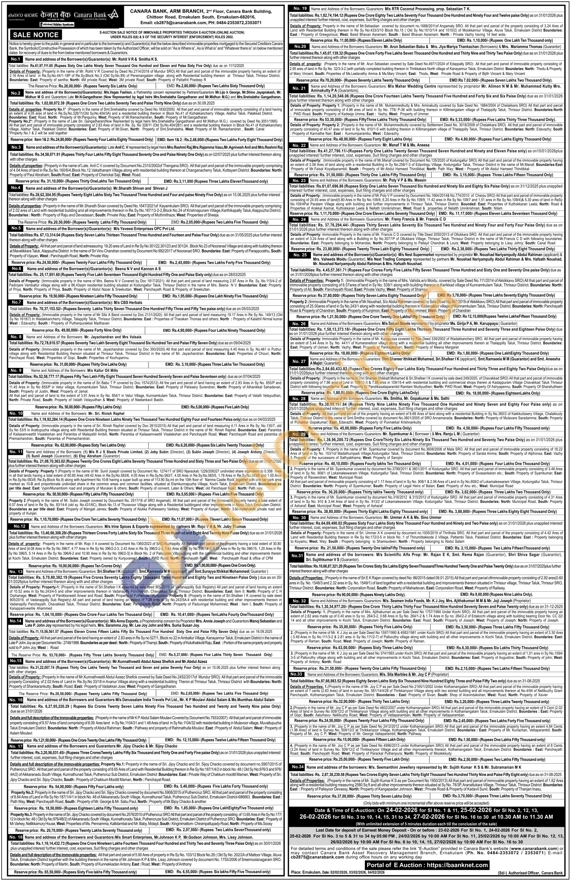 Details of properties: (Property in the name of Mr. Sharath Sivan covered by Deed No. 1647/2021 of Kayamkulam SRO) All that part and parcel of the immovable property comprising of 2.02 ares of Land with residential building and all improvements thereon in Re.Sy. No. 187/13-2-2, Block No.24 of Krishnapuram Village, Karthikapally Taluk, Alappuzha District. Boundaries: North: Property of Raju and Devadasan; South: Private Way; East: Property of Muthinithaze; West: Properties of Sheeja.