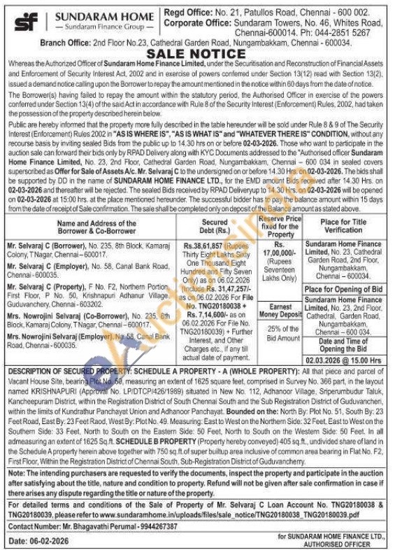 DESCRIPTION OF SECURED PROPERTY: SCHEDULE A PROPERTYA (WHOLE PROPERTY): All that piece and parcel of Vacant House Site, bearing Plot No. 50, measuring an extent of 1625 square feet, comprised in Survey No. 366 part, in the layout named KRISHNAPURI (Approval No. LP/DTCP/426/1989) situated in New No. 112, Adhanoor Village, Sriperumbudur Taluk, Kancheepuram District, within the Registration District of South Chennai South and the Sub Registration District of Guduvancheri, within the limits of Kundrathur Panchayat Union and Adhanoor Panchayat. Bounded on the: North By: Plot No. 51, South By: 23 Feet Road, East By: 23 Feet Raod, West By: Plot No. 49. Measuring: East to West on the Northem Side: 32 Feet, East to West on the Southern Side: 33 Feet, North to South on the Eastern Side: 50 Feet, North to South on the Westem Side: 50 Feet, In all admeasuring an extent of 1625 Sq.ft. SCHEDULE B PROPERTY (Property hereby conveyed) 405 sq.ft., undivided share of land in the Schedule A property herein above together with 750 sq.ft. of super builtup area inclusive of common area bearing in Flat No. F2. First Floor, Within the Registration District of Chennai South, Sub-Registration District of Guduvancherry