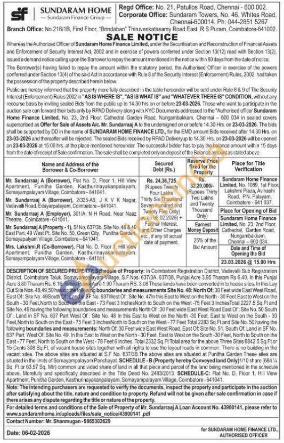 DESCRIPTION OF SECURED PROPERTY: Schedule of Property: In Coimbatore Registration District, Vadavalli Sub Registration District, Coimbatore Taluk, Somayampalayam Village, S.F.Nos. 637/3A, 637/38, Punjai Acre 3.95 Tharam Rs 6.40. In this Punjal Acre 3.80 Tharam Rs. 6. 16. In this Pujnai Acre 1.90 Tharam RS. 3.08 These lands have been converted in to house siles. In this Lay Out Site Nos. 48.49.50 having the following boundaries and measurements Site No. 48: North Of: 30 Feet wide East West Road, East Of: Site No. 49South Of: Land in SF No. 637West Of: Site No. 47 in this East to West on the North-30 Feet, East to West on the South-30 Feet North to South on the East-73 Feet 3 Inches North to South on the West-75 Feet 3 Inches Total 2227.5 Sq Ft and Site No. 49 having the following boundaries and measurements North Of: 30 Feet wide East West Road East Of: Site No. 50 South Of Land in SF No. 637 Part West Of Site No. 48 in this East to West on the North -30 Feet, East to West on the South-30 Feet, North to South on the East-75 Feet 3 inchesNorth to South on the West-77 Feet Total 2283 Sq. Ft and Site No. 50 having the following boundaries and measurements: North Of: 30 Feet wide East West Road, East Of: Site No. 51, South Of. Land in SF No. 637 Part, West Of: Site No. 49. In this East to West on the North-30 Feet, East to West on the South-30 Feet, North to South on the East-77 Feet, North to South on the West-78 Feet 6 Inches. Total 2332 Sq. Ft Total area for the above Three Sites 6842.5 Sq Ft or 15 Cents 308 Sq.Ft. of vacant house sites together with all rights to use the layout roads in common. There is no building in the vacant sites. The above sites are situated at S.F No. 637/38. The above sites are situated at Punitha Garden. These sites are situated in the limits of Sornayampalayam Panchayat. SCHEDULE-B (Property hereby Conveyed land Only) 1/10 share (684% Sq. Ftor 63.57 Sq. Mtr) common undivided share of land in all that piece and parcel of the land being mentioned in the schedule above. Morefully and specifically described in the Title Deed No. 2483/2013. SCHEDULE-C: Flat No. D, Floor 1, Hill View Apartment, Punitha Garden, Kasthurinayakanpalayam, Sormayampalayam Village, Coimbatore-641041