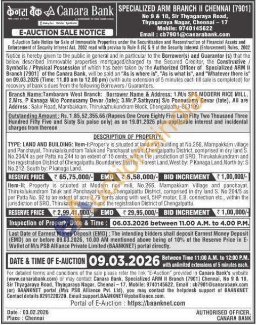 TYPE: LAND AND BUILDING: Item-I:Property is situated at land and building at No. 266, Mampakkam village and Panchayat, Thirukalukundram Taluk and Panchayat union, Chengalpattu District, comprised in dry land S No.204/4 as per Patta no.244 to an extent of 15 cents, within the jurisdiction of SRO, Thirukalukundram and the registration District of Chengalpattu. Boundaries: East by: Forest Land, West by: P Kanaga Land, North by: S No.212, South by: P kanaga Land