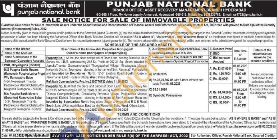 Property No. I; All that the piece and parcel of Open Land, bearing Block No. 04 in Survey no. 148/E, admeasuring 242 Sq. Yards or 202.31 Sq. Meters situated at JamukuThanda, Grampanchayathi Thungapahad Village, Miryalaguda Mandal, Nalgonda District, Telangana standing in the name of Smt. Ramavath Pushpalatha and bounded by Boundaries: North: 12-0" Existing Road, South: House of Jawarharlal, East: House of Bitcha, West: Place of Meghya