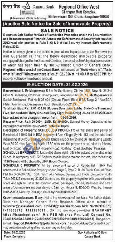 SCHEDULE C PROPERTY: All that piece and parcel of Residential 1 BHK Flat constructed in Schedule A Property under Stage 2, Type 2, B-36 Block, Ground Floor, Flat No B-36-004 "Alur BDA Flats", Alur Village, Dasanapura Hobili, Bangalore North Taluk 562123 measuring 33.526 Sq mtrs and the property together with proportionate share and right to use in the common areas, passages, lobbies, staircases and other areas of common use and boundary on: East by: House No 836/005, West by: House No 836/003, North by: Passage, South by: House No 836/001