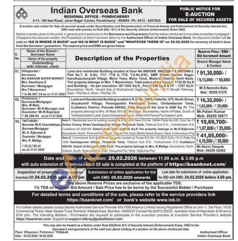 Commercial land & Godown property located at Punjai R.S.No 131/3B.R.S.No. 131/3 Palta No 1506 Vasistapuram Village, Thittakudi Taluk, Tittakudi Sub R.D., Vridhachalam RD Cuddalore-606106. Extent of the land: 4360 Sq.ft. The property belongs to Mrs. R.Malliga. Boundaries: North Enkarai, South: Rajkumar Plot, East: Rasupillai Plot, West: Rajkumar Plot