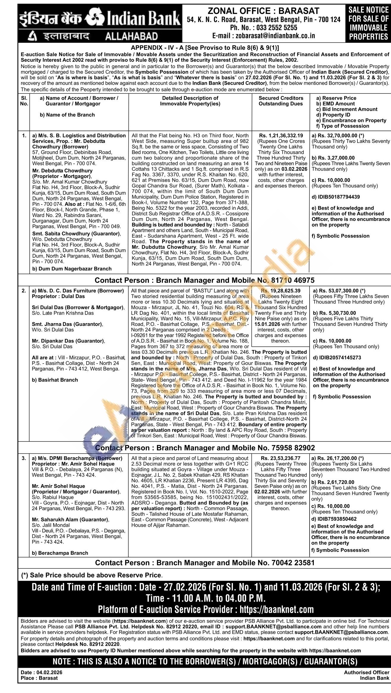 All that the Fiat being No. H3 on Third floor, North West Side, measuring Super builtup area of 982 Sq.ft be the same or less space, Consisting of Two Bed rooms, Orie Kitchen, Two Toilets, ots, Little one living cum two balcony and proportionate share of the buliding constructed on land measuring an arma 14 Cottans 13 Chittacks and 1 Sq.ft comprised in R.S Fag No. 3367, 3370, under R.S. Khaitan No. 620, 621 at Premises No. 63/15. Dum Dum Road, now Gopal Chandra Sur Road, (Surer Math), Kolkata 700 074, within the limit of South Dum Dum Municipality, Dum Dum Police Station, Registered in Book-l, Volume Number 132. Page from 371-388. Being No 5322 for the year 2003, recorde orded in Addi District Sub Registrar Off Office of A.D.S.R-Cossiporo Dum Dum West Bengal Building is butted and bounded by: North-Satabd Apartment and others Land, South Municipal Road, East-Sudarshana Apartment, West-25 Ft. wide Road. The Property stands in the name of Mr. Dubdutta Chowdhury, S/o Mr. Amal Kumar Chowdhury, Flat No. H4, 3rd Floor, Block A, Sudhir Kunja, 63/15, Dum Dum Road, South Dum Dum. North 24 Parganas. West Bengal, 700 074
