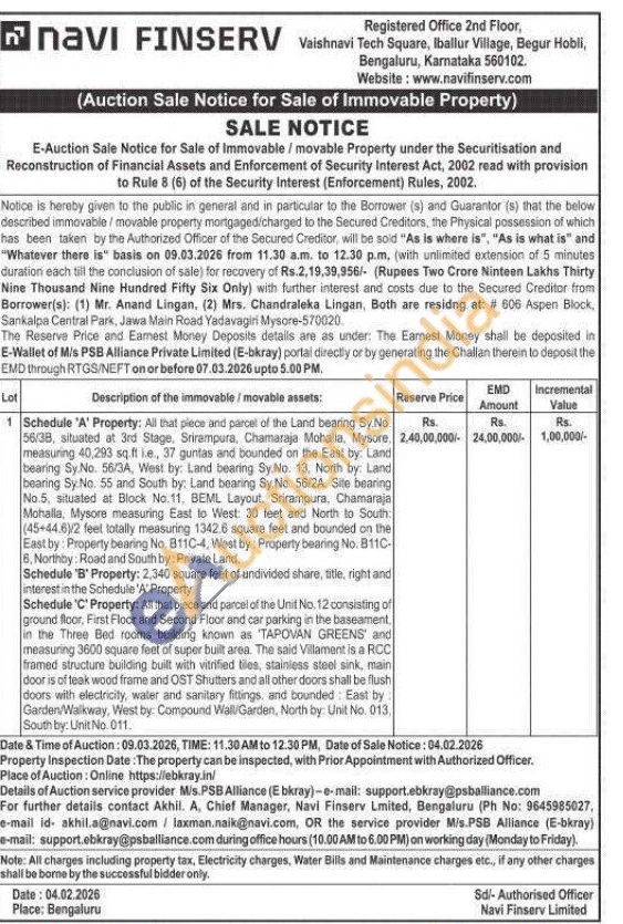 Schedule 'A' Property: All that plece and parcel of the Land bearing Sy.No. 56/38, situated at 3rd Stage, Srirampura, Chamaraja Mohalla, Mysore. measuring 40,293 sq.ft ie., 37 guntas and bounded on the East by: Land bearing Sy No. 56/3A, West by: Land bearing Sy.No. 13, North by: Land bearing Sy.No. 55 and South by: Land bearing Sy.No. 56/2A. Site bearing No 5, situated at Block No.11, BEML Layout, Srirampura, Chamaraja Mohalla, Mysore measuring East to West: 30 feet and North to South (45+44.6)/2 feet totally measuring 1342.6 square feet and bounded on the East by: Property bearing No. 811C-4, West by: Property bearing No. B11C-6, Northby: Road and South by: Private Land,Schedule 'B' Property: 2,340 square feet of undivided share, title, right and interest in the Schedule 'A' Property Schedule 'C' Property: All that piece and parcel of the Unit No. 12 consisting of ground floor, First Floor and Second Floor and car parking in the baseament, in the Three Bed rooms building known as 'TAPOVAN GREENS' and measuring 3600 square feet of super built area. The said Villament is a RCC framed structure building built with vitrified tiles, stainless steel sink, main door is of teak wood frame and OST Shutters and all other doors shall be flush doors with electricity, waler and sanitary fittings, and bounded East by: Garden/Walkway, West by: Compound Wall/Garden, North by: Unit No. 013, South by: Unit No. 011.