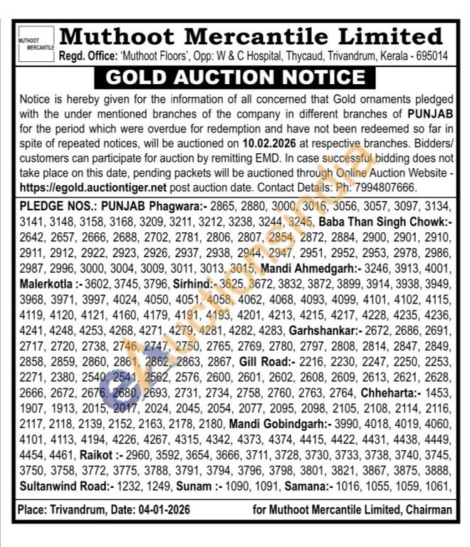 Muthoot Mercantile Limited Gold Auctions Auction in Trivandrum
