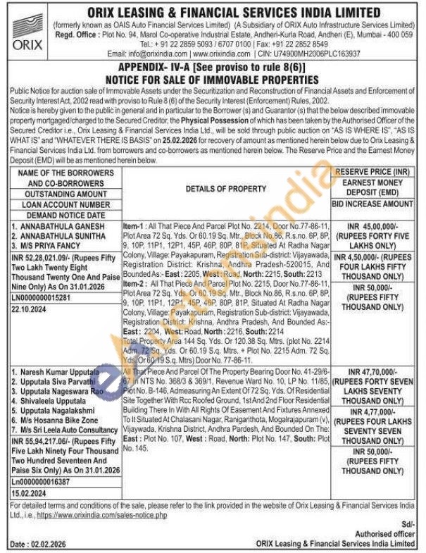 All That Piece And Parcel Of The Property Bearing Door No. 41-29/6-67 In NTS No. 368/3 & 369/1, Revenue Ward No. 10, LP No. 11/85, Plot No. B-146, Admeasuring An Extent Of 72 Sq. Yds. Of Residential Site Together With Roc Roofed Ground, 1st And 2nd Floor Residential Building There In With All Rights Of Easement And Fixtures Annexed To It Situated At Chalasani Nagar, Ranigarithota, Mogalrajapuram (v). Vijaywada, Krishna District, Andhra Pardesh, And Bounded On The: East: Plot No. 107, West: Road, North: Plot No. 147, South: Plot No. 145.