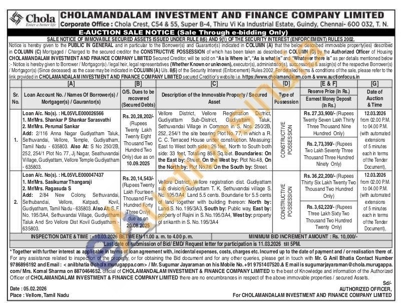 Vellore District, Vellore Registration District, Gudiyattam Sub-District, Gudiyattam Taluk, Sethuvandai Village in Common in S. Nos. 250/28, 252, 254/1 the site bearing Plot No. 77, in which a R. C. C. Terraced House under construction. Measuing: East to West both side: 26 feet, North to South both side: 33 feet, Totalling 858 Sq.feet. Boundaries: On the East by: Street, On the West by: Plot No.48, On the North by: Plot No.76, On the South by: Street