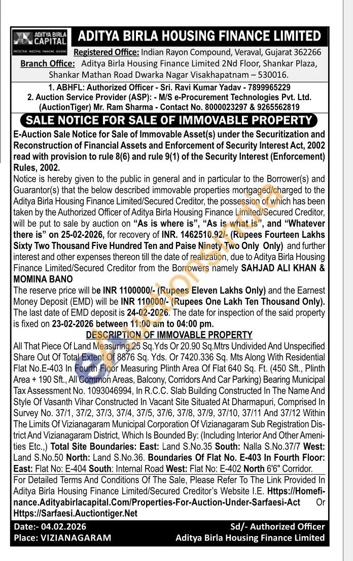 All That Piece Of Land Measuring 25 Sq. Yds Or 20.90 Sq.Mtrs Undivided And Unspecified Share Out Of Total Extent Of 8876 Sq. Yds. Or 7420.336 Sq. Mts Along With Residential Flat No.E-403 In Fourth Floor Measuring Plinth Area Of Flat 640 Sq. Ft. (450 Sft., Plinth Area + 190 Sft., All Common Areas, Balcony, Corridors And Car Parking) Bearing Municipal Tax Assessment No. 1093046994, In R.C.C. Slab Building Constructed In The Name And Style Of Vasanth Vihar Constructed In Vacant Site Situated At Dharmapuri, Comprised In Survey No. 37/1, 37/2, 37/3, 37/4, 37/5, 37/6, 37/8, 37/9, 37/10, 37/11 And 37/12 Within The Limits Of Vizianagaram Municipal Corporation Of Vizianagaram Sub Registration Dis-trict And Vizianagaram District, Which Is Bounded By: (Including Interior And Other Ameni-ties Etc.,) Total Site Boundaries: East: Land S.No.35 South: Nalla S.No.37/7 West: Land S.No.50 North: Land S.No.36. Boundaries Of Flat No. E-403 In Fourth Floor: East: Flat No: E-404 South: Internal Road West: Flat No: E-402 North 6'6" Corridor