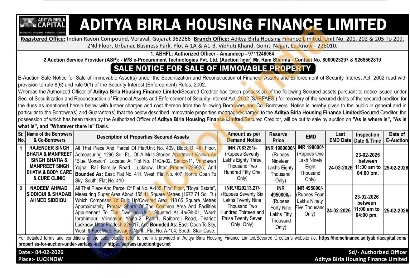All That Piece And Parcel Of Flat No. A-105, First Floor, "Royal Estate", Measuring Super Area About 155.41 Square Metres (1672.71 Sq. Ft.) Which Comprises Of Built Up/Covered Area 118.65 Square Metres Approximately, Prorata Share Of The Common Area And Facilities Appurtenant To The Dwelling Unit, Situated At 4a/Gh-01, Ward: Ibrahimpur, Vrindavan Yojna-2, Part-1, Raibareli Road, District: Lucknow, Uttar Pradesh-226017, And Bounded As: East: Open To Sky. West: 8 Feet Wide Passage, North: Flat No. A-104, South: Stair Case