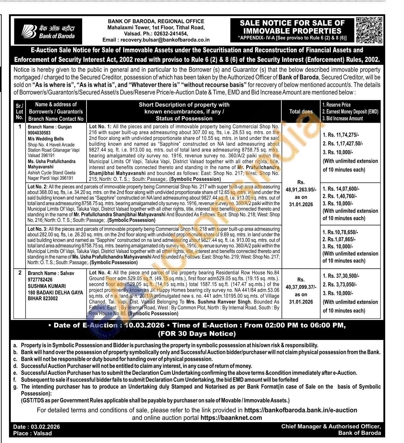 Lot No. 1: All the pieces and parcels of immovable property being Commercial Shop No. 216 with super built-up area admeasuring about 307.00 sq. fts, i.e. 28.53 sq. mtrs, on the 2nd floor along with undivided proportionate share of 10.55 sq. mtrs. in land under the said building known and named as "Sapphire" constructed on NA land admeasuring about 9827.44 sq. ft. i.e. 913.00 sq. mtrs. out of total land area admeasuring 8758.75 sq. mtrs. bearing amalgamated city survey no. 1916, revenue survey no, 360/A/2 paiki within the Municipal Limits Of Vapi, Taluka Vapi, District Valsad together with all other rights, title, interest and benefits connected thereto and standing in the name of Mr. Prafulichandra Shamjibhai Mahyavanshi and bounded as follows: East: Shop No. 217; West: Shop No. 215; North: O. T. S.; South: Passage; (Symbolic Possession