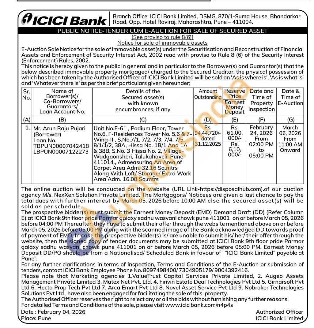 Unit No.F-61, Podium Floor, Tower No.6, F-Residences Tower No. 5,6 & 7-Wing-II, S.No. 7/1, 7/2, 7/3, 7/4, 7/5, 8/1/1/2, 38A, Hissa No. 1B/1 And 1A & 38B, S.No. 3 Hissa No. 2, Village-Wadgaonsheri, Talukahaveli, Pune 411014., Admeasuring An Area of Carpet Area Adm. 32.16 Sq.mtrs Along With Loft/Storage/ Extra Work Area Adm. 16.08 Sq.mtrs