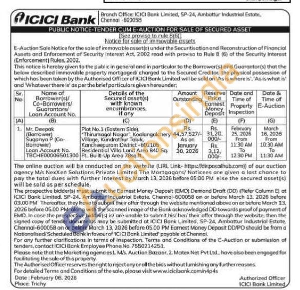 Plot No.1 (Eastern Side), Village, Kundrathur Taluk Kancheepuram District-602105 Ft., Built-Up Area 78sq.ft.. "Thirumagal Nagar", Koolangalchery Residential Villa Land Area 840 Sq.