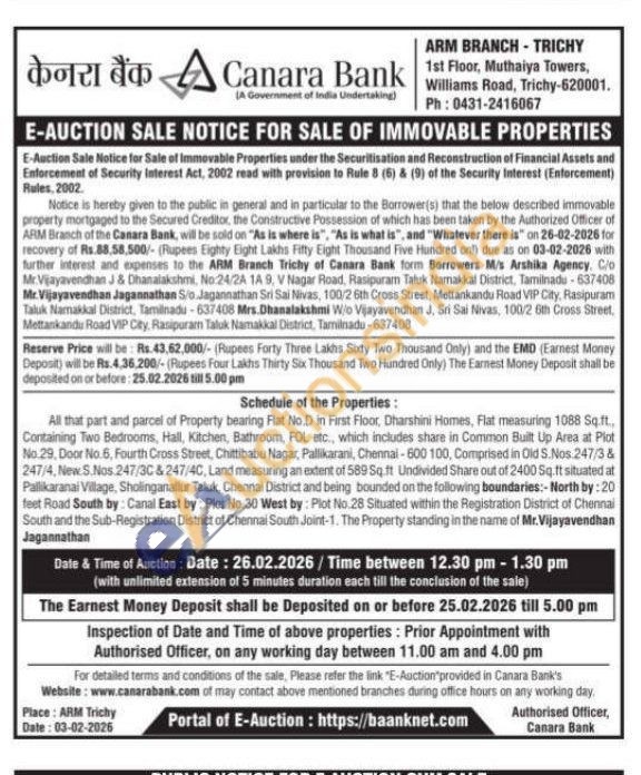 All that part and parcel of Property bearing Flat No.D in First Floor, Dharshini Homes, Flat measuring 1088 Sq.ft., Containing Two Bedrooms, Hall, Kitchen, Bathroom, FOL etc., which includes share in Common Built Up Area at Plot No.29, Door No. 6, Fourth Cross Street, Chittibabu Nagar, Pallikarani, Chennai-600 100, Comprised in Old S. Nos 247/3 & 247/4, New S.Nos 247/30 & 247/4C, Land measuring an extent of 589 Sq. ft. Undivided Share out of 2400 Sq.ft situated at Pallikaranai Village, Sholinganallur Taluk, Chennal District and being bounded on the following boundaries:-North by: 20 feet Road South by: Carnal East by: Plot No.30 West by: Plot No.28 Situated within the Registration District of Chennai South and the Sub-Registration District of Chennai South Joint-1. The Property standing in the name of Mr. Vijayavendhan Jagannathan