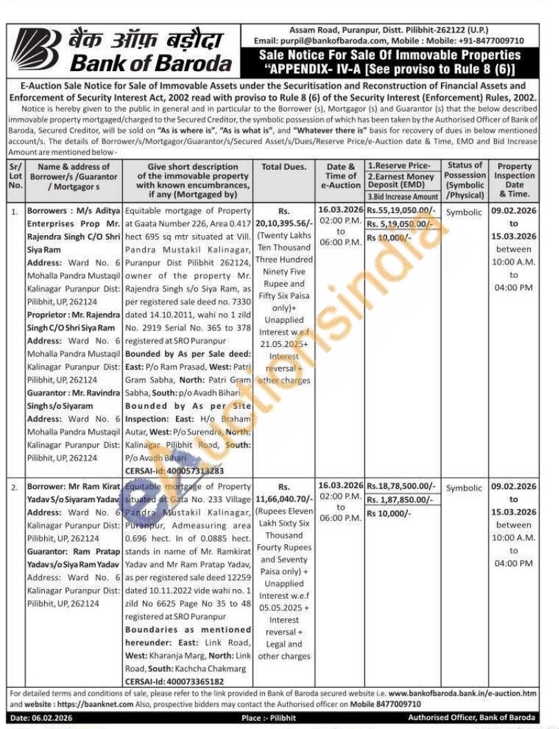Equitable mortgage of Property at Gaata Number 226, Area 0.417 hect 695 sq mtr situated at Vill. Pandra Mustakil Kalinagar, Puranpur Dist Pilibhit 262124, owner of the property Mr. Rajendra Singh s/o Siya Ram, as per registered sale deed no. 7330 dated 14.10.2011, wahi no 1 zild No. 2919 Serial No. 365 to 378 registered at SRO Puranpur Bounded by As per Sale deed: East: P/o Ram Prasad, West: Patri Gram Sabha, North: Patri Gram Sabha, South: p/o Avadh Bihari Bounded by As per Site 6 Inspection: East: H/o Braham Autar, West: P/o Surendra, North: Kalinagar Pilibhit Road, South: P/o Avadh Bihari