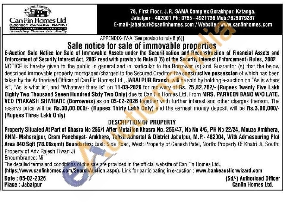 Property Situated At Part of Khasra No 255/1 After Mutation Khasra No. 255/47, Nb No 4/6, PH No 22/24, Mouza Amkhera, RNM- Maharajpur, Gram Panchayat-Amkhera, Tehsil Adhartal & District Jabalpur, M.P.- 482004, With Admeasuring Plot Area 840 Sqft (78.06sqmt) Boundaries: East: Side Road, West: Property of Ganesh Patel, North: Property Of Khatri Ji, South: Property of Adv Rajesh Tiwari Ji