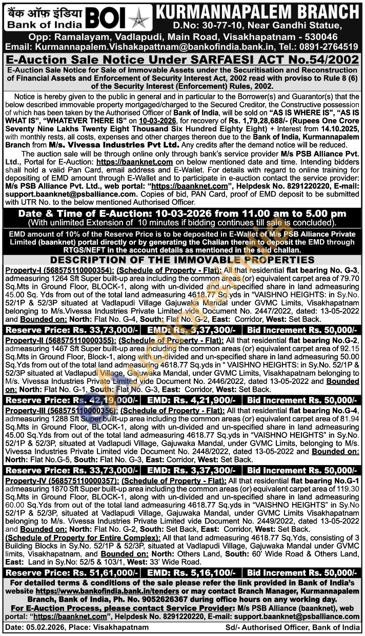 Property-III (568575110000356): (Schedule of Property Flat): All that residential flat bearing No.G-4, admeasuring 1288 Sft Super built-up area including the common areas (or) equivalent carpet area of 81.94 Sq.Mts in Ground Floor, BLOCK-1, along with un-divided and un-specified share in land admeasuring 45.00 Sq. Yds from out of the total land admeasuring 4618.77 Sq.yds in "VAISHNO HEIGHTS" in Sy.No. 52/1P & 52/3P, situated at Vadlapudi Village, Gajuwaka Mandal, under GVMC Limits, belonging to M/s. Vivessa Industries Private Limited vide Document No. 2448/2022, dated 13-05-2022 and Bounded on: North: Flat No.G-5, South: Flat No. G-3, East: Corridor, West: Set Back.