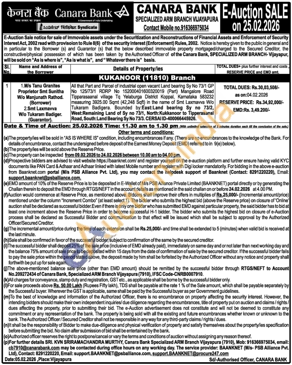 All that Part and Parcel of industrial open vacant Land bearing Sy No 73/1 GP No 125/73/1 RDRP No 152000401600320019 (Part) Mangalore Road Tipparasaanal village Tq Yelaburga District Koppal, Karnataka 583232 measuring 3925.00 Sqmt (42,248 Sqft) in the name of Smt Laxmavva W/o Tukaram Badigera. Bounded by:East:Land bearing Sy no 73/2, West:Remaining Land of Sy no 73/1, North: Kukkanoor to Tipperasanal Road, South: Land Bearing Sy No 73/3. CERSAI ID-400066445926.