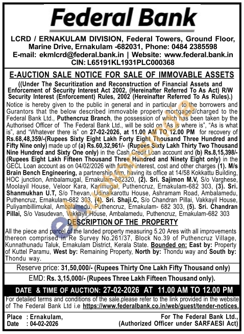 All the piece and parcel of the landed property measuring 5.20 Ares with all improvements thereon comprised in Re Survey No.261/37, Block No.39 of Puthencruz Village, Kunnathunadu Taluk, Ernakulam District, Kerala State. Bounded on: East by: Property of Kuttel Paramu, West by: Remaining Property, North by: Thondu way and South by: Thondu way.