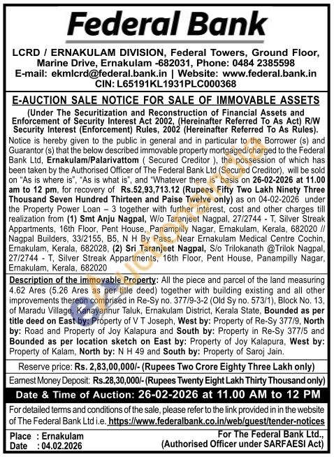 Description of the immovable Property: All the piece and parcel of the land measuring 4.62 Ares (5.26 Ares as per title deed) together with building existing and all other improvements thereon comprised in Re-Sy no. 377/9-3-2 (Old Sy no. 573/1), Block No. 13, of Maradu Village, Kanayannur Taluk, Ernakulam District, Kerala State, Bounded as per title deed on East by: Property of VT Joseph, West by: Property of Re-Sy 377/9, North by: Road and Property of Joy Kalapura and South by: Property in Re-Sy 377/5 and Bounded as per location sketch on East by: Property of Joy Kalapura, West by: Property of Kalam, North by: N H 49 and South by: Property of Saroj Jain.