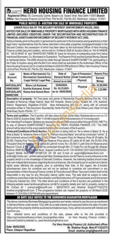 Description of property: "All That pece and parcel of Residential Property Bearing Plot No. 10-8 Situaled at Revenus Village Kakroli. Near EST Hospital, Shant Colony, Khasra No. 276, Kankrok District Rajsamand, Rajasthan-313324 Are Admeasuring 943 54. FL along with all commod amenities written in Tite Document, Bounded By: North-Plot No. 10-A, East-Others Land: West-14 Foot Wide Road South-PlotNo. 11,