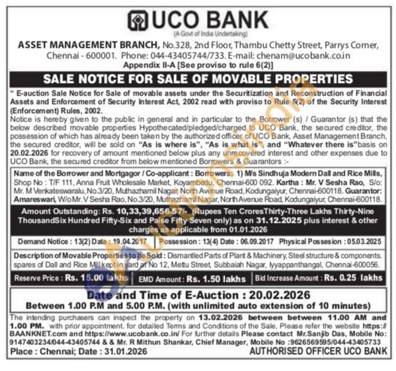 Description of Movable Properties to be Sold: Dismantled Parts of Plant & Machinery, Steel structure & components. spares of Dall and Rice Mill kept in yard at No 12, Mettu Street, Subbaiah Nagar, Iyyappanthangal , Chennai-600056.