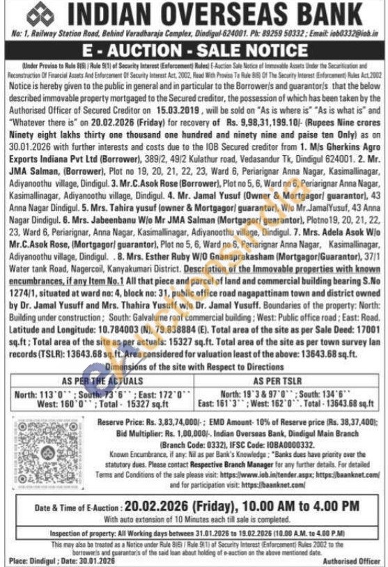 All that piece and parcel of land and commercial building bearing S.No 1274/1, situated at ward no: 4, block no: 31, public office road nagapattinam town and district owned by Dr. Jamal Yusuff and Mrs. Thahira Yusuff w/o Dr. Jamal Yusuff. Boundaries of the property: North: Building under construction: South: Galvalume roof commercial building: West: Public office road: East: Road. Latitude and Longitude: 10.784003 (N), 79.838884 (E). Total area of the site as per Sale Deed: 17001 sq.ft; Total area of the site as per actuals: 15327 sq.ft. Total area of the site as per town survey lan records (TSLR): 13643.68 sq.ft. Area considered for valuation least of the above: 13643.68 sq.ft.