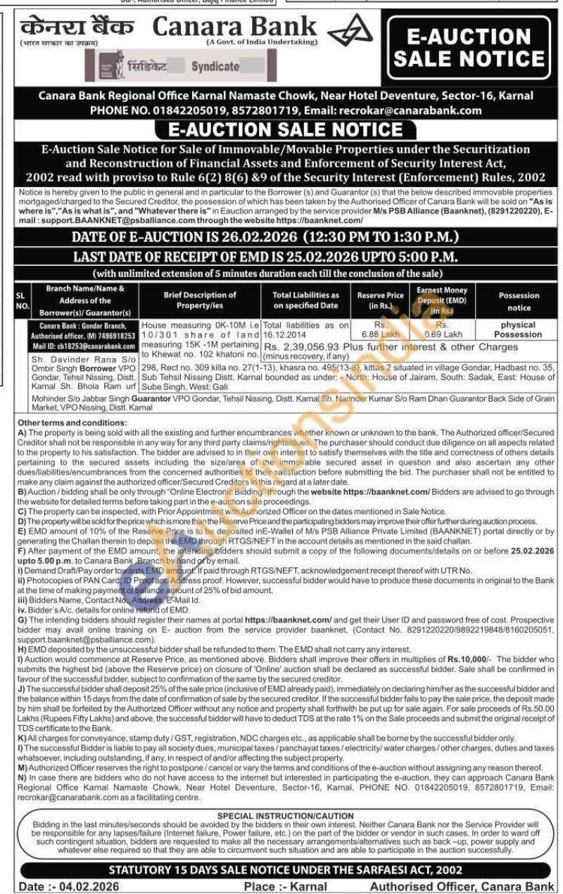 House measuring OK-10M Le 10/301 share of land measuring 15K-1M pertaining to Khewat no. 102 khatoni no.298, Rect no. 309 killa no. 27(1-13), khasra no. 495(13-8), kittas 2 situated in village Gondar, Hadbast no. 35, Sub Tehsil Nissing Distt. Karnal bounded as under: North: House of Jairam, South: Sadak, East: House of Sube Singh, West: Gali