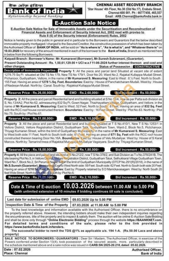 : All the piece and parcel Residential land and building situated at S No 13/4, now as per Patta sub division as S. No. 13/4A2, Plot No 62, admeasuring 832 Sq Ft. Gowri Nagar, Thazhayattam Village, Gudiyatham, and Vellore, in the name of Mr Kumaravel S. Measuring: East to West: 52 Feet, North to South: 6 Feet. Having an area of 832 Sq. Feet with the RCC roof house constructed thereon. Boundaries: East by: 16 Feet Street. West by: Plot No.63. North by: Plot No. 75. South by: Plot No.61.