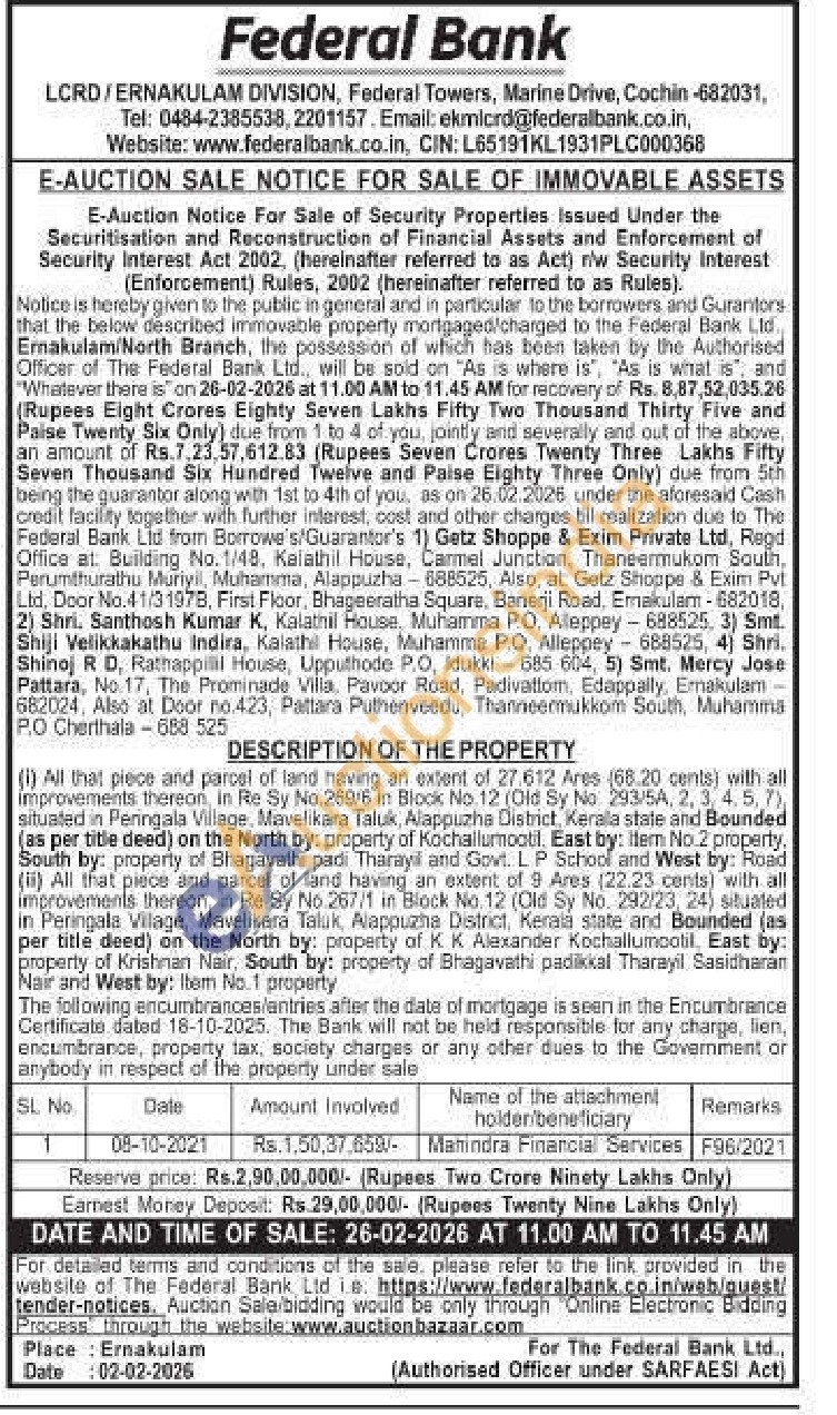 (1) All that piece and parcel of land having an extent of 27.612 Ares (68.20 cents) with all Improvements thereon, in Re Sy No.269/6 in Block No. 12 (Old Sy No: 293/5A, 2, 3, 4, 5, 7) situated in Peningala Village, Mavelikara Taluk, Alappuzha District, Kerala state and Bounded (as per title deed) on the North by: property of Kochallumootil, East by: Item No.2 property, South by: property of Bhagavathi padi Tharayil and Govt. LP School and West by: Road (ii) All that piece and parcel of land having an extent of 9 Ares (22.23 cents) with all improvements thereon, in Re Sy No.267/1 in Block No.12 (Old Sy No. 292/23, 24) situated in Peringala Village, Mavelikara Taluk, Alappuzha District, Kerala state and Bounded (as per title deed) on the North by: property of K K Alexander Kochallumcotil, East by: property of Krishnan Nair, South by: property of Bhagavathi padikkal Tharayil Sasidharan Nair and West by: Item No.1 property