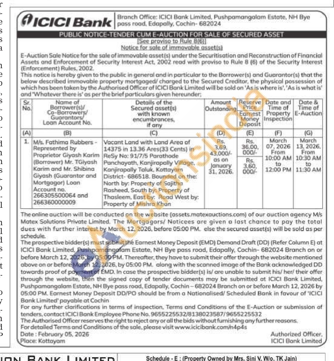 Vacant Land with Land Area of 14375 in 13.36 Ares(33 Cents) in ReSy No: 91/7/5 Parathode Panchayath, Kanjirapally Village, Kanjirapally Taluk, Kottayam District-686518. Bounded on the: North by: Property of Sajitha Rasheed, South by: Property of Thasleem, East by: Road West by: Property of Mishra Khan