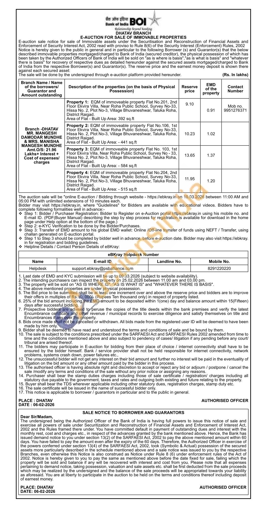 Property 4: EQM of immoveable property Flat No.204, 2nd Floor Ekvira Villa, Near Roha Public School, Survey No-33, Hissa No. 2, Plot No-3, Village Bhuvaneshwar, Taluka Roha, District Raigad. Area of Flat - Built Up Area: - 515 sq.ft