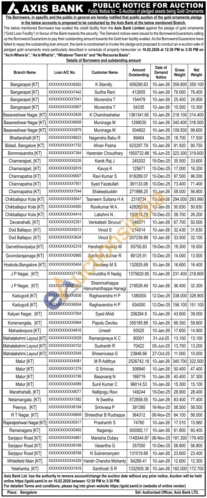 Axis Bank Gold Auctions Auction in Bengaluru