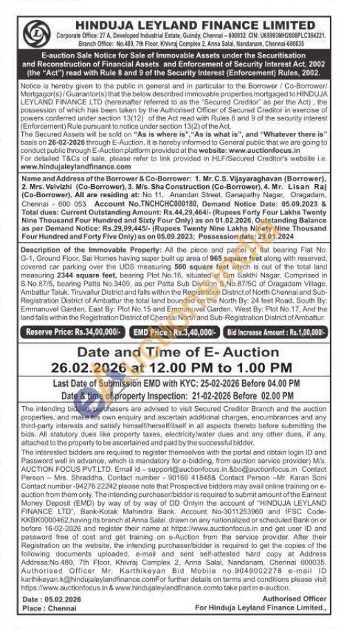 Description of the Immovable Property: All the piece and parcel of flat bearing Flat No. G-1, Ground Floor, Sai Homes having super built up area of 965 square feet along with reserved, covered car parking over the UDS measuring 500 square feet which is out of the total land measuring 2344 square feet, bearing Plot No.16, situated at Om Sakthi Nagar, Comprised in S.No.87/5, bearing Patta No 3409, as per Patta Sub Division S.No.87/5C of Oragadam Village, Ambattur Taluk. Tiruvallur District and falls within the Registration District of North Chennai and Sub-Registration District of Ambattur the total land bounded on the North By: 24 feet Road, South By: Emmanuvel Garden, East By: Plot No. 15 and Emmanuvel Garden, West By: Plot No. 17, And the land falls within the Registration District of Chennai North and Sub-Registration District of Ambattur