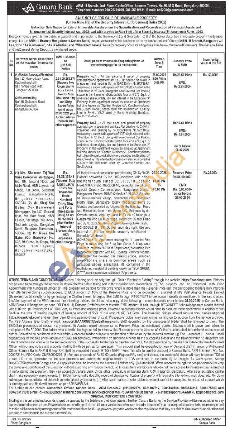 Property No.2: All that piece and parcel of property comprising one apartment unit, Le, Flat bearing No C-404, in converted land bearing Sy no.108/2, Katha No.522/108/2 measuring a super built-up area of 1089 Sq. ft. situated in the Third floor, in 'C Block, along with one Covered Car Parking space in the Basement Surface/Stit floor and 270 Sq.ft. of undivided share, rights, title and interest in the Schedule "A" Property, in the Apartment known as situated at Apartment building known as "Garden Residency, Kanchanayakana-halli, Jigani Hobali, Anekal taluk and bounded on: East by: Lift Area, West by: Rasidential Apartment privately numbered as C-405 in the third floor, North by: Common Comidor and South Area