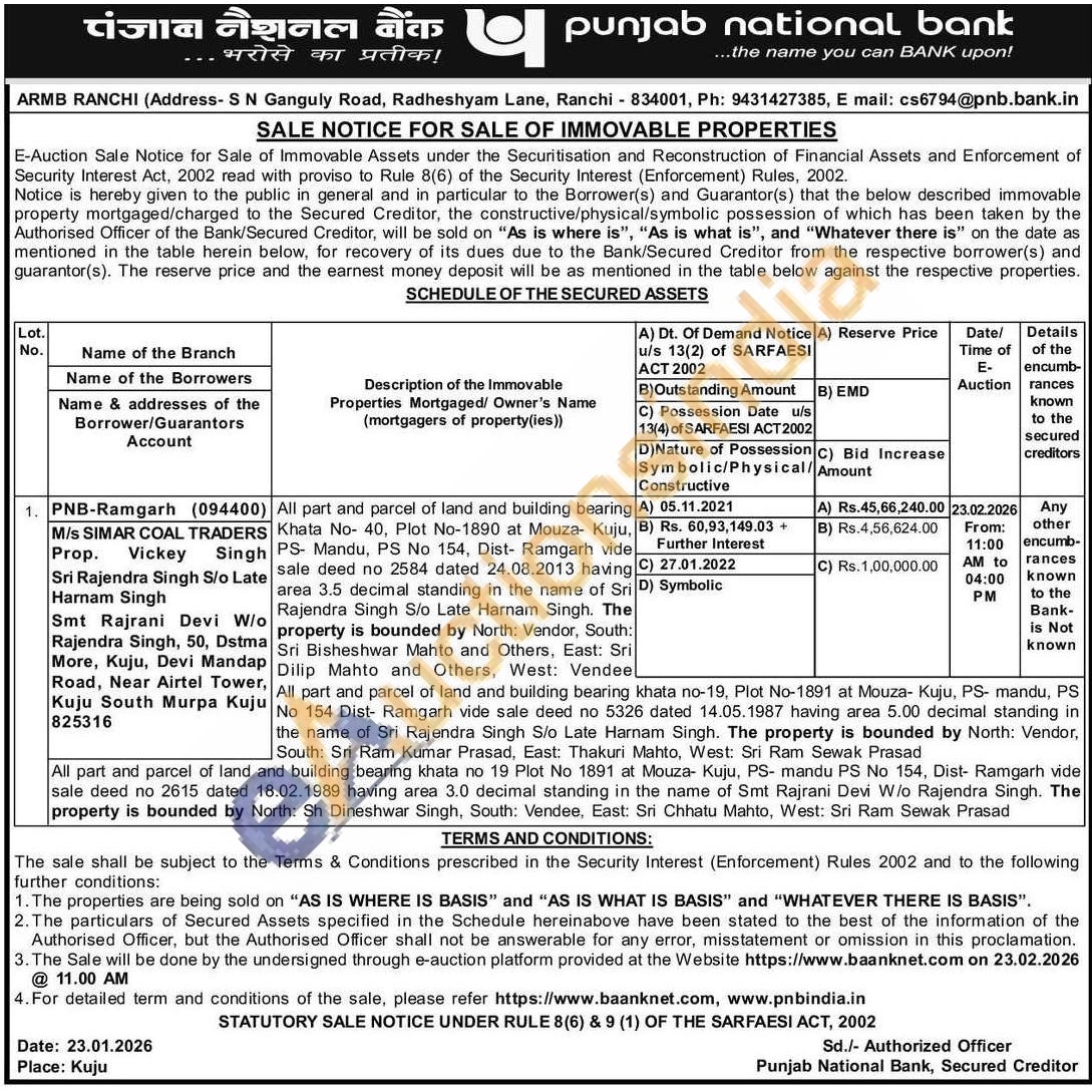 All part and parcel of land and building bearing Khata No- 40, Plot No-1890 at Mouza- Kuju, PS- Mandu, PS No 154, Dist- Ramgarh vide sale deed no 2584 dated 24.08.2013 having area 3.5 decimal standing in the name of Sri Rajendra Singh S/o Late Harnam Singh. The property is bounded by North: Vendor, South: Sri Bisheshwar Mahto and Others, East: Sri Dilip Mahto and Others, West: Vendee All part and parcel of land and building bearing khata no-19, Plot No-1891 at Mouza- Kuju, PS- mandu, PS No 154 Dist- Ramgarh vide sale deed no 5326 dated 14.05.1987 having area 5.00 decimal standing in the name of Sri Rajendra Singh S/o Late Harnam Singh. The property is bounded by North: Vendor, South: Sri Ram Kumar Prasad, East: Thakuri Mahto, West: Sri Ram Sewak Prasad All part and parcel of land and building bearing khata no 19 Plot No 1891 at Mouza- Kuju, PS- mandu PS No 154, Dist- Ramgarh vide sale deed no 2615 dated 18.02.1989 having area 3.0 decimal standing in the name of Smt Rajrani Devi W/o Rajendra Singh. The property is bounded by North: Sh Dineshwar Singh, South: Vendee, East: Sri Chhatu Mahto, West: Sri Ram Sewak Prasad