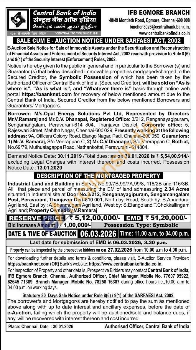 Industrial Land and Building in Survey No.99/7B,99/7A,99/8, 116/2B and 116/3B, All that piece and parcel of measuring the EM of land admeasuring 2.34 Acres situated in Industrial site at Door No.3/212, Renganayagipuram, Sengamangalam Post, Peravurani, Thanjavur Dist-610 001, North by: Road, South by: S.Annadurai Agri land, East by: A.Shanmugam Agri land, West by: S.Elango and T.Chokkallingam Agri land; Property Owned by V.Ramaraj