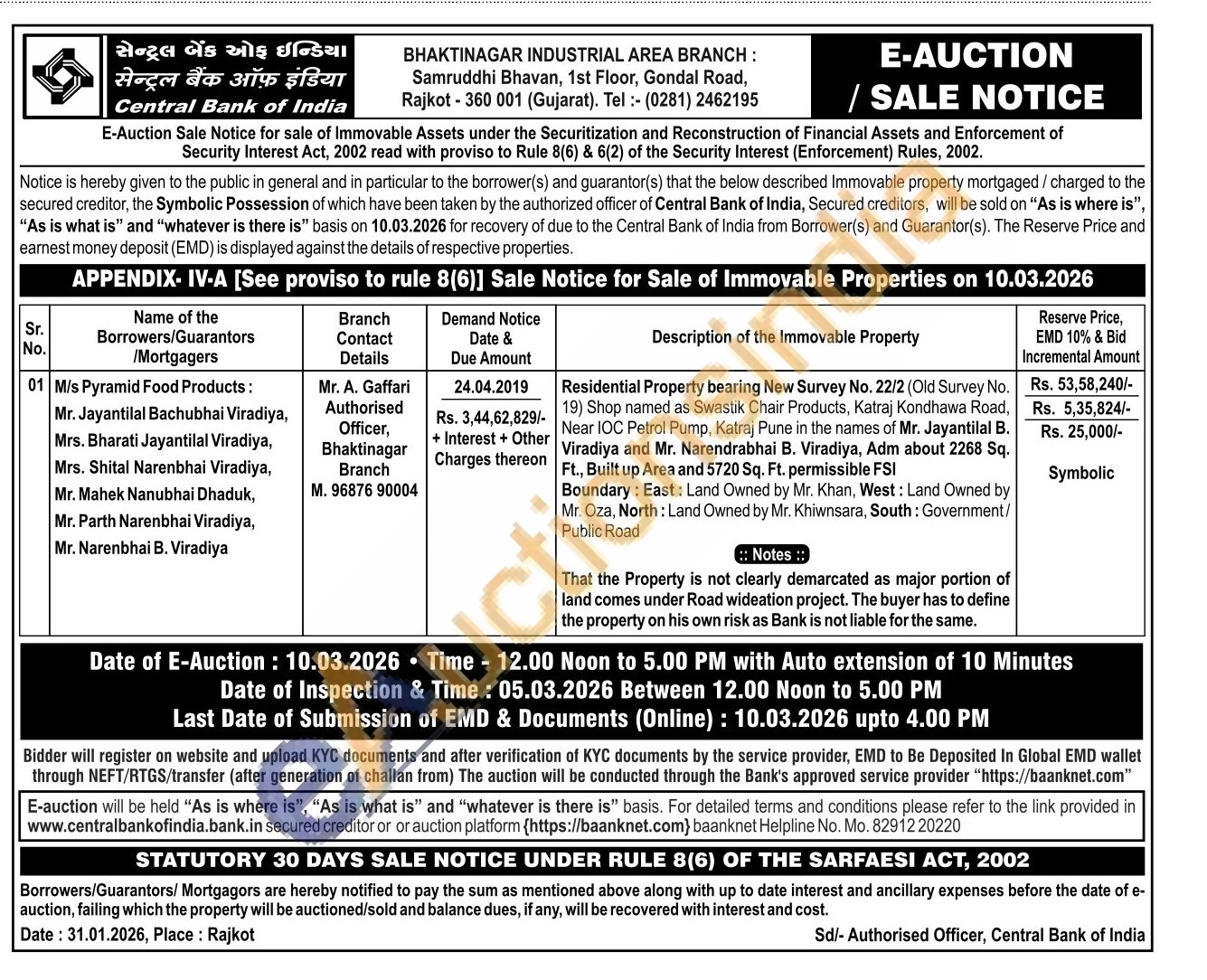 Residential Property bearing New Survey No. 22/2 (Old Survey No. 19) Shop named as Swastik Chair Products, Katraj Kondhawa Road, Near IOC Petrol Pump, Katraj Pune in the names of Mr. Jayantilal B. Viradiya and Mr. Narendrabhai B. Viradiya, Adm about 2268 Sq. Ft., Built up Area and 5720 Sq. Ft. permissible FSI Boundary: East: Land Owned by Mr. Khan, West: Land Owned by Mr. Oza, North: Land Owned by Mr. Khiwnsara, South: Government/Public Road
